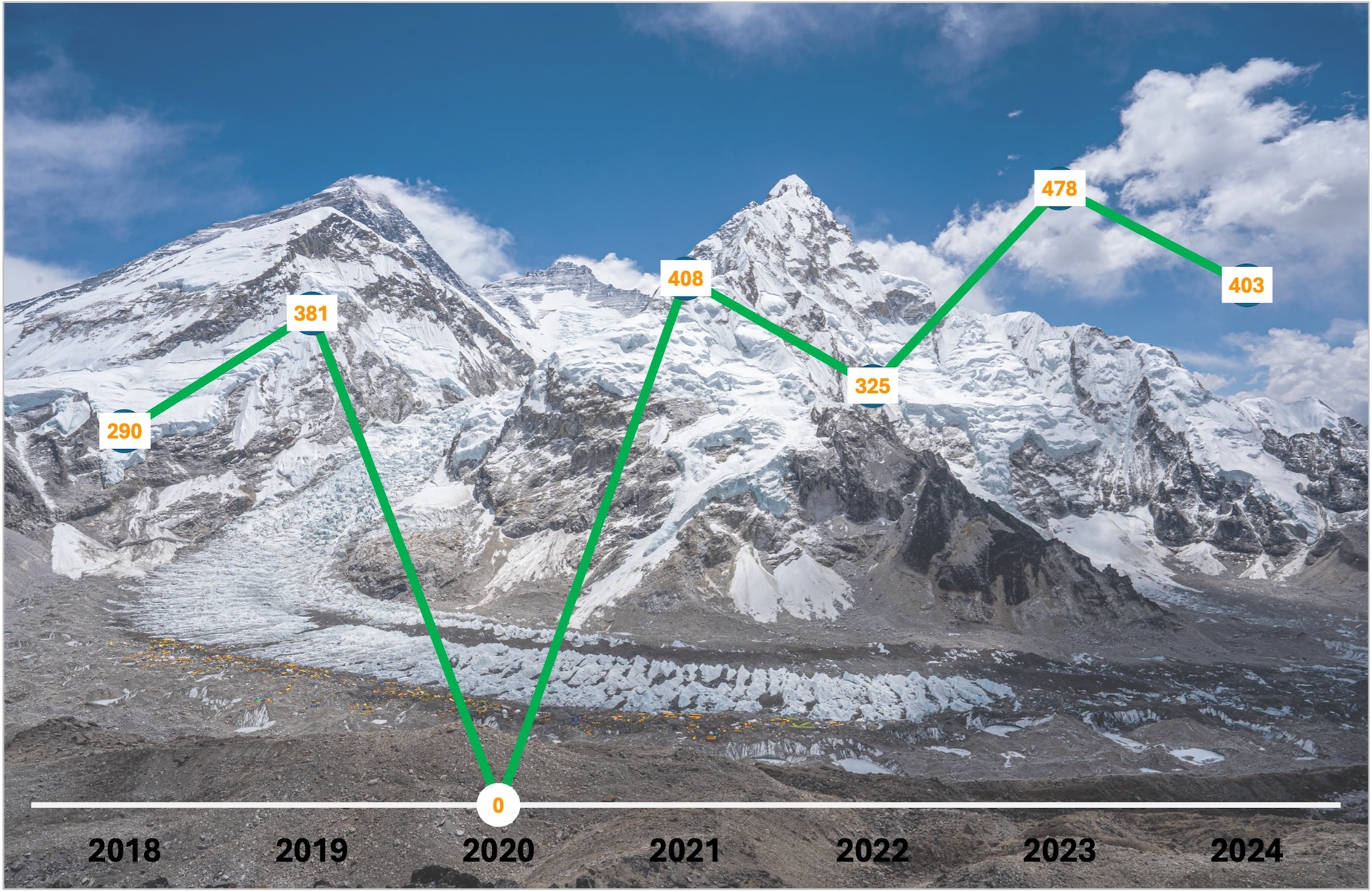 In 2021, Nepal’s Department of Tourism issued a record 408 permits for Everest, a number that decreased to 325 in 2022 due to the pandemic's impact. In 2023, the government issued 478 permits, while the overall number of permits for all mountains exceeded 1000 in the spring season.